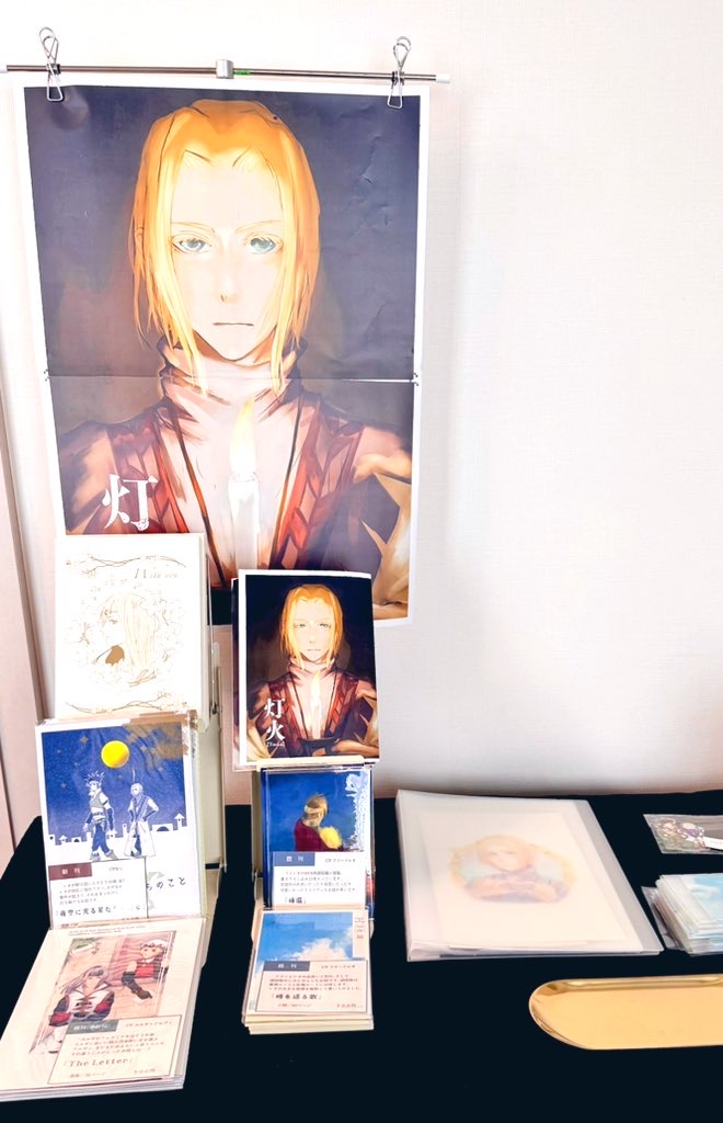 2025/08/06 日記 設営ごっこをしてみていました。ポスターの発注で悩んでおり、背面A1じゃなくてクランプ使ってで前面A2だとどうだろうってコンビニで試し印刷してみたものです背面ポスターは目立つけど大きくて周りに気を使うので、これでちょうどいいかもしれないです新刊終わったら値札とかも作らねば敷布は新しく黒を買って、道具も買い足したら設営めちゃくちゃ楽になりました