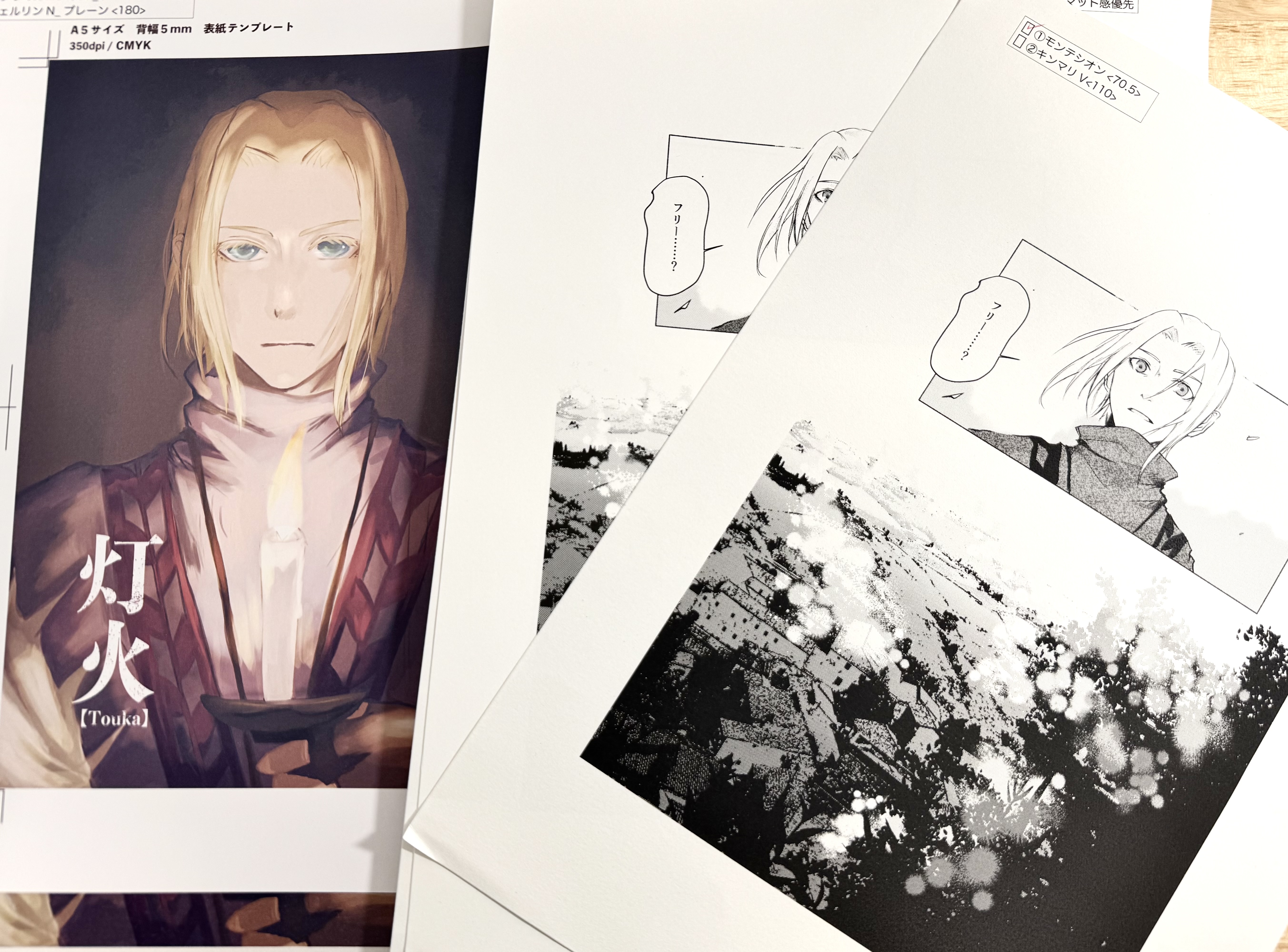 2025/08/13 日記 入稿したー🥳データチェックを待つのみ…解放感すごい!!!!!途中別の本も挟んだけど、3ヶ月頑張った……嬉しいっ!9/21は、新刊2冊出ます!!写真は印刷所さんが期間限定でやってる試し刷りサービスです本文用紙、モンテシオンとキンマリV110kgで悩んでたのと(110kgで本文厚いと開きにくくない…?など)表紙もそもそも特殊紙使うかとか特色入れるか悩んでたので試せて良かった!結果シンプルイズベストでアート紙+特色なしにしました出来上がりが楽しみだなあ見本誌もイベント前に送ってくださるようなのでわくわく