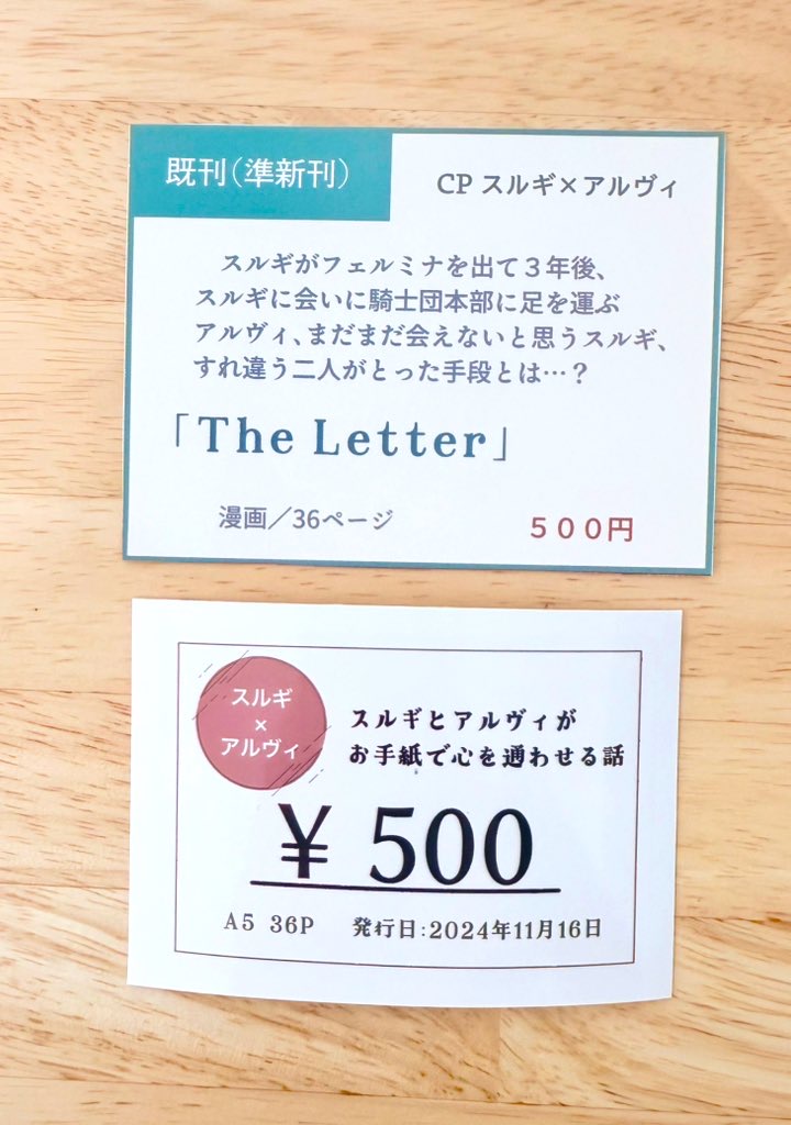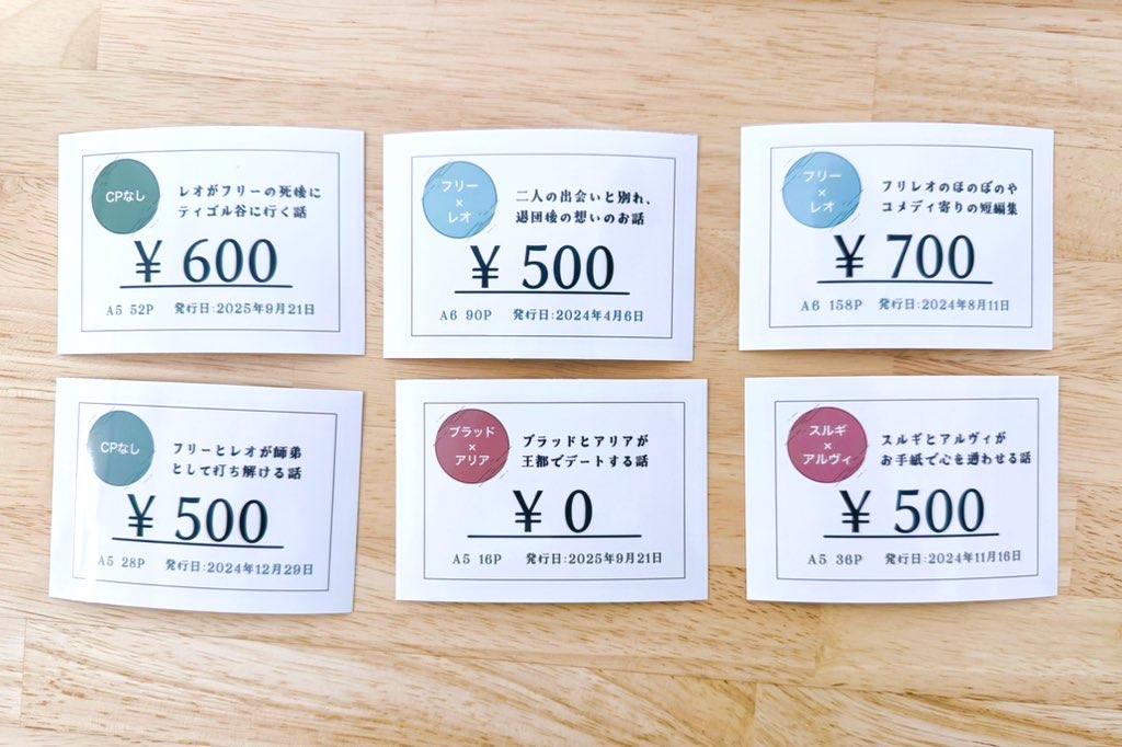 2025/08/14 日記 値札を改良してました•あらすじを会場で全部読むのは難しいので、一言でまとめる•毎回値札作りしなくてもいいよう新刊表示を外して発行年月日を入れた(頒布種類が多いので重要)•カプ有無を一目でわかるように•タイトルは大事ではないので外す視認性アップしたかも…!あとは見本誌ににベタ貼りでつけるかクリップポップで横に沿わせるか悩みます