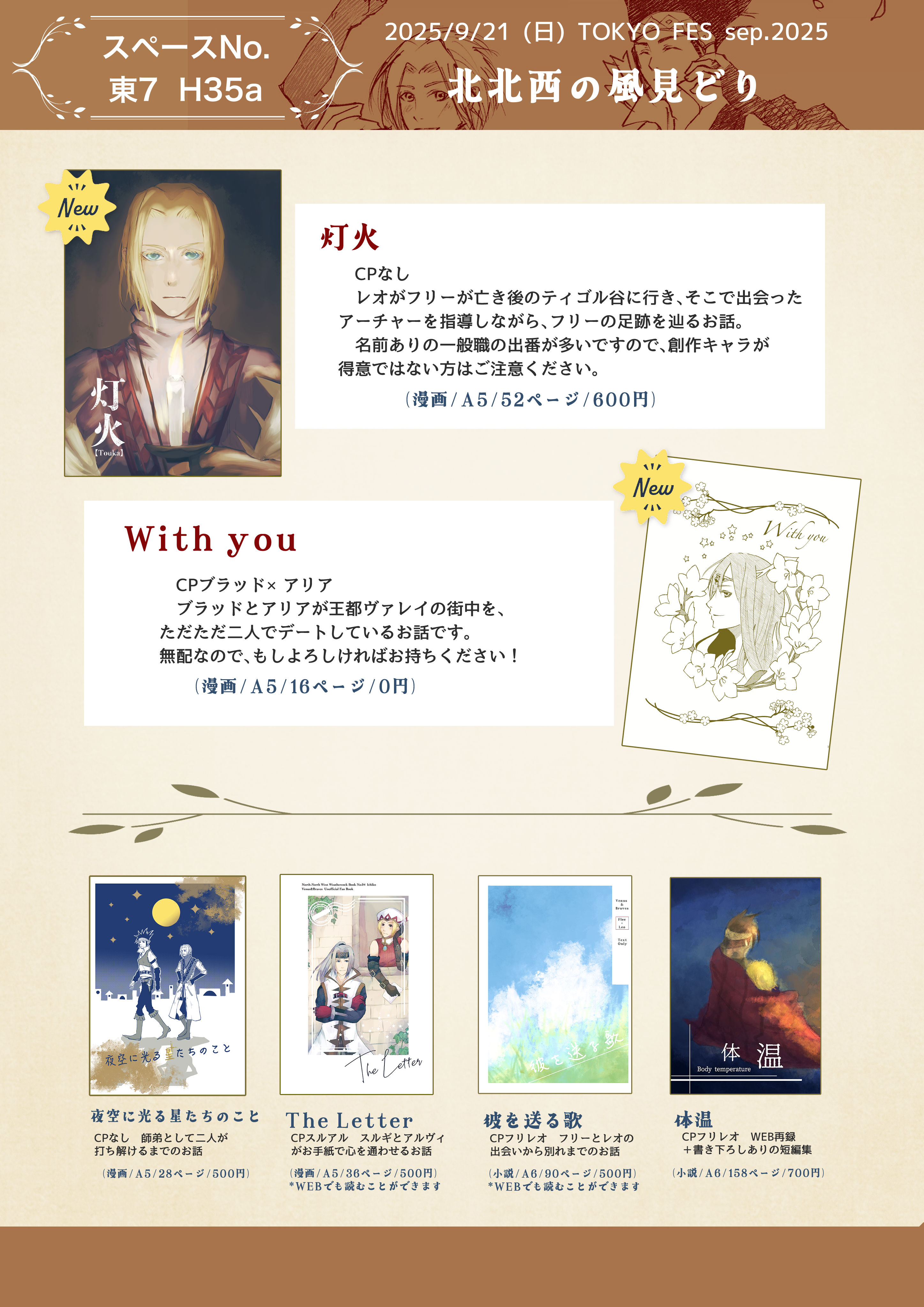 2025/08/29 情報 まだかなーと思っていたらスペースNo.出ました!9/21(日) TOKYO FES Sep.2025【東7ホール H35a】北北西の風見どりとなります!お品書き 漫画サンプル 新刊は2冊あります。詳細は上記リンクかオフライン情報をご覧ください〜。当日は売り子さんをお願いしているので、スペースにはどの時間帯でも誰かしらいる予定です。また、当日残部確定次第、Boothにて通販も予定しています。コミケばっかり参加していて赤ブー初めてなのでど緊張しております……22年前のゲームかつオンリージャンル以外のスペースでの配置なので、誰も来ないのでは……?とひやひや。無配があるので気軽に遊びにきていただけたら嬉しいです。また前日にもアナウンスします。よろしくおねがいします!